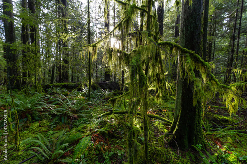 Fototapeta premium Beautiful Scenic View of the Green and Vibrant Rain Forest during a sunny day after rain fall in wintertime. Taken in Lynn Canyon Park, North Vancouver, British Columbia, Canada.