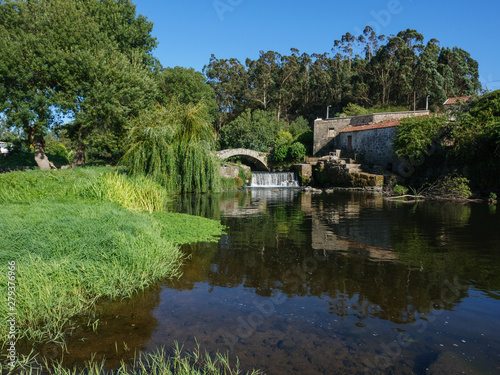 © Barry, Fototapeta premium Beautiful scenic view over river Este in Portugal, on a sunny summer day with blue sky. Old stone bridge, ruin of stone house, and overhanging willow tree on bank.