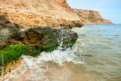 © soleg, Naklejka premium beautiful sea landscape, closeup of stone on the beach, sea coast with high hills, wild nature