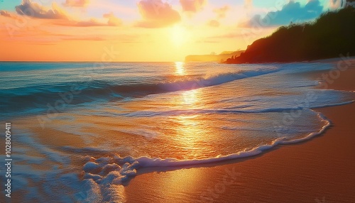 © Arber, Fototapeta premium beautiful sea side summer beach in sunrise lights waves beach coast line nature in sunlight ocean sunset horizon landscape vacation happiness concept slow motion