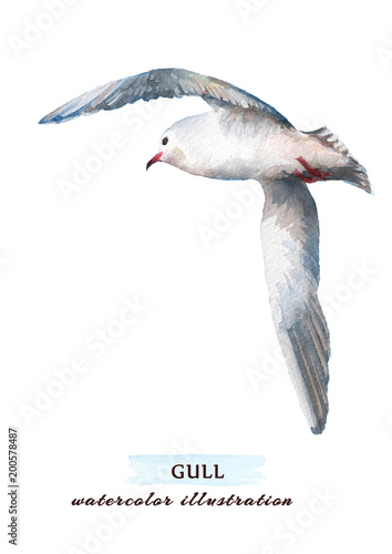 © Jenny Klein, Fototapeta premium Beautiful seagull flying into the sky. Watercolor hand drawn illustration, isolated on a white background.