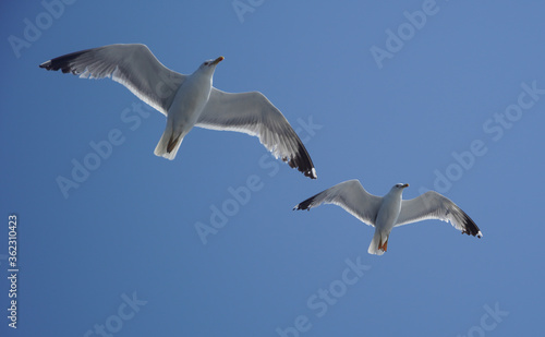 Obraz premium Beautiful seagulls following a ferry boat in Greece