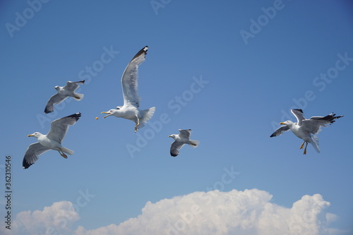 Fototapeta premium Beautiful seagulls following a ferry boat in Greece