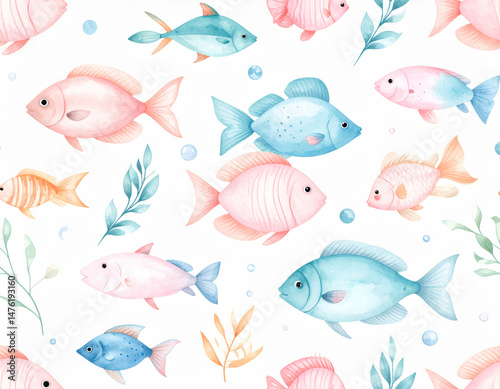 Fototapeta premium beautiful seamless pattern featuring colorful fish in various shades of pink, blue, and orange, surrounded by delicate aquatic plants and bubbles, creating serene underwater atmosphere