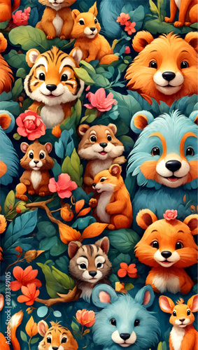© Govindan maruthai, Naklejka premium Beautiful seamless vector floral pattern with animals and tropical leaves flowers, spring summer background, palm leaves, jungle leaf, Wild animals, bird, Exotic wallpaper, Hawaiian, watercolor style