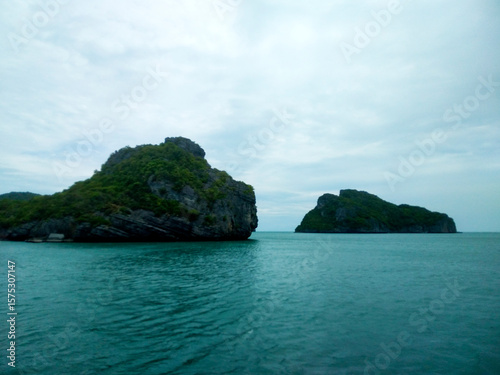 © redbeach, Fototapeta premium Beautiful Seascape with Mountains, Blue Ocean, and Islands under Clear Sky at Ang Thong National Marine Park, Koh Samui, Thailand