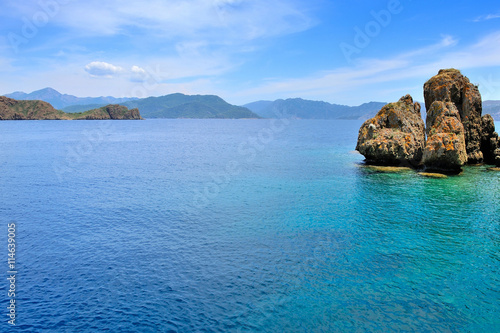 © nmelnychuk, Naklejka premium Beautiful seascape with rocky islands. Aegean sea. Turkey