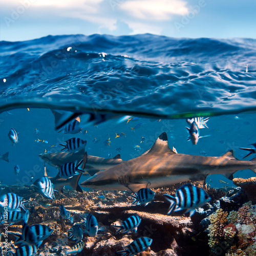 Naklejka premium beautiful seaview waterline waves in a shallow and sharks swimming by corals