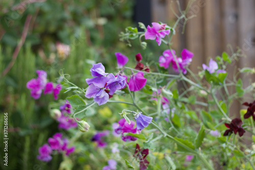 Fototapeta premium Beautiful selection of coloured sweet peas in garden with copy space