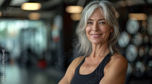 © James, Fototapeta premium Beautiful senior woman with a perfect body, smiling and posing at the gym after her workout.