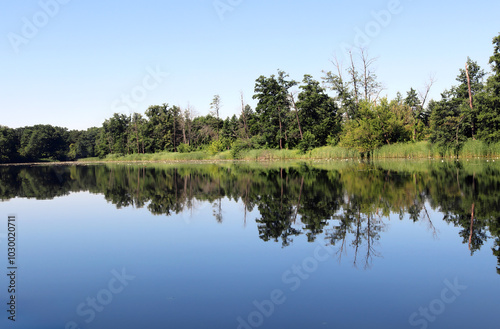 © catocala, Obraz premium Beautiful serene river reflecting lush greenery under clear blue sky at midday