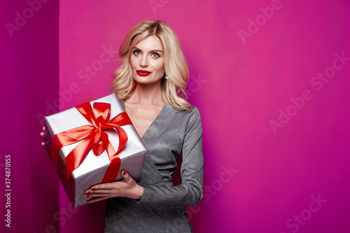 Fototapeta premium Beautiful sexy young blond girl with wavy hair bright evening make-up red lips long fluffy eyelashes hold gift box holiday New Year joy fun happy merry Christmas Eve party celebration.