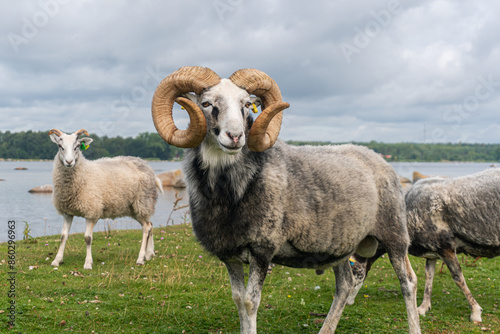 © Bohdan, Naklejka premium Beautiful sheep with twisted horns grazing in the wild near the sea
