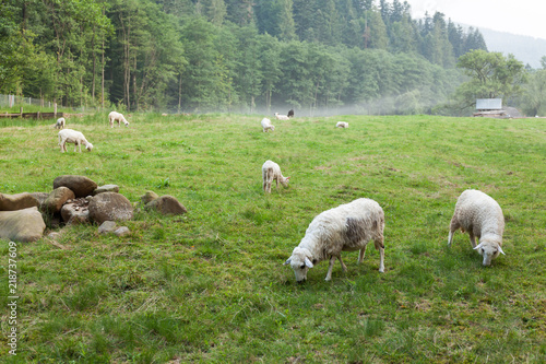 © Andrii Zastrozhnov, Obraz premium Beautiful sheeps, wool farm. Autumn countryside. Lamb on field.