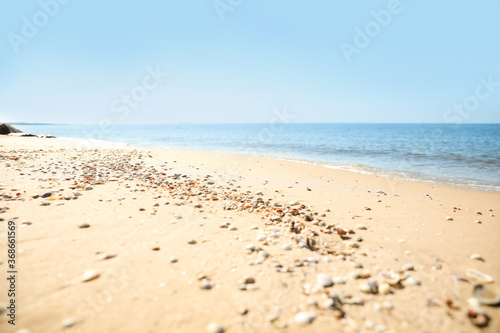 Fototapeta premium Beautiful shells on sandy beach near sea, closeup