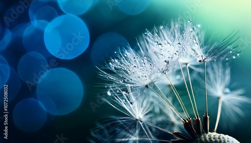 © Charles, Obraz premium beautiful shiny dew water drop on dandelion seed in nature macro soft selective focus sparkling bokeh dark blue green background