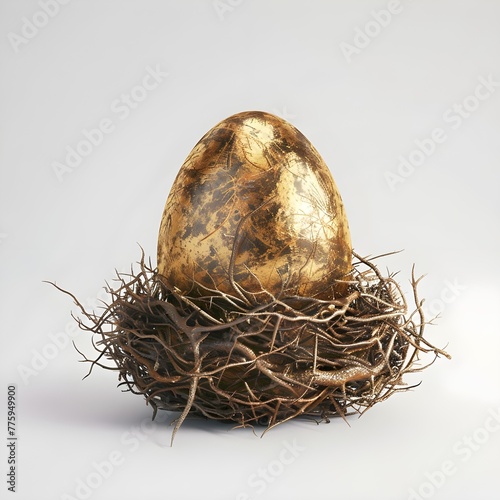 Obraz premium Beautiful shiny golden egg in bird nest against white background - Ai Generated