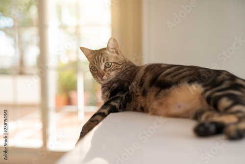 Naklejka premium Beautiful short hair cat lying on white table at home