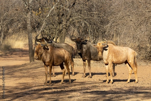© Douw/Wirestock Creators, Fototapeta premium Beautiful shot of a group of wildebeests in a field