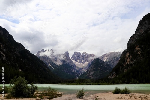 © Wirestock, Naklejka premium Beautiful shot of a lake with a mountainous landscape in the background