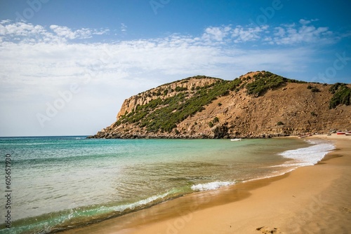 Fototapeta premium Beautiful shot of a sunny rocky seashore with a cliff on a summer day in Kef Abbed, Tunisia