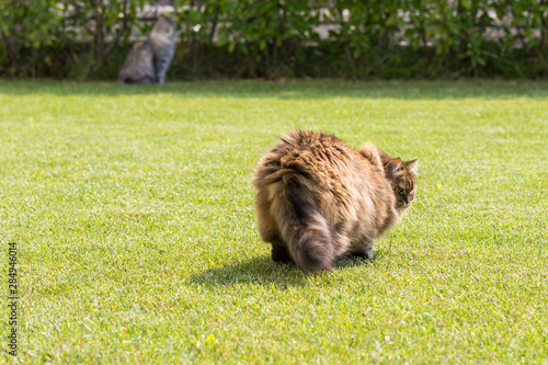 Fototapeta premium Beautiful siberian cat in a garden, playing on the grass green