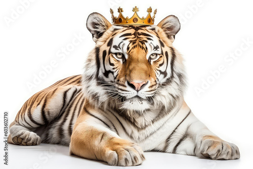 © Anastasiia, Naklejka premium Beautiful Siberian Tiger In Gold Crown On White Background. Generative AI