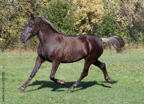 © goldika, Obraz premium Beautiful silvery-black mare trotting on the green meadow