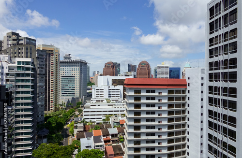 © Jim, Naklejka premium Beautiful Singapore skyline panorama with blue skies and puffy clouds.