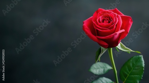 Fototapeta premium Beautiful single red rose with vibrant petals and green leaves on a dark background for romantic themes