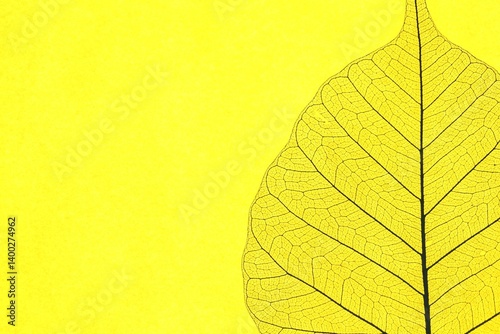© New Africa, Obraz premium Beautiful skeleton leaf on yellow background, macro view. Space for text