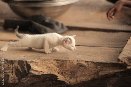 Fototapeta premium beautiful skinny white kitten standing on a wooden handmade bench with black...