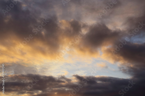 Obraz premium Beautiful sky at sunset. Sunlight illuminates clouds, dark clouds.