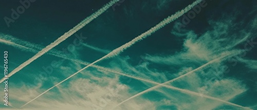 © annetdebar, Fototapeta premium Beautiful sky filled with airplane contrails and wispy clouds at sunset