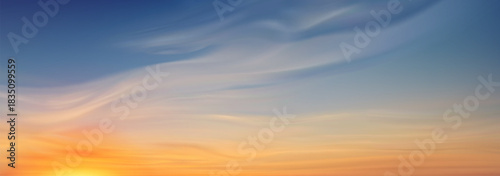 Naklejka premium Beautiful sky gradient with soft clouds at sunset. Pastel blue and orange hues blend across horizon. dramatic Backdrop for nature scene landscape with golden sunlight and peaceful twilight colors.