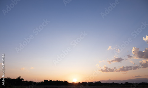 © DifferR, Fototapeta premium Beautiful sky, sun and cloud at high. Landscape include space, light of nature, sunset, sunrise, horizon or skyline. Colorful with yellow, orange and blue color at evening time for background.