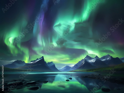 © Md, Obraz premium Beautiful Sky with Aurora and Stars - Green Northern Lights Background with Ample Copy Space.