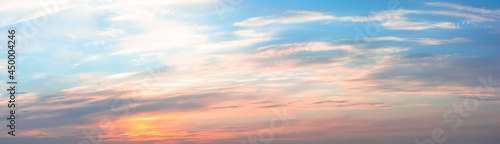 Obraz premium Beautiful sky with clouds at sunset, panoramic big shot. Background from the...