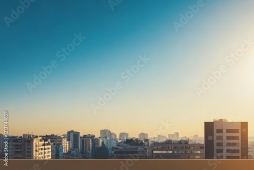 © JuanM, Fototapeta premium Beautiful skyline view of a city during the golden hour with clear blue skies