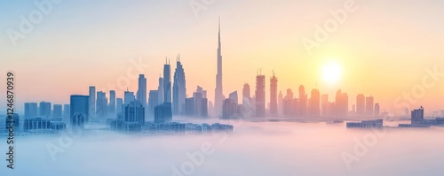 © Aris Suwanmalee, Fototapeta premium Beautiful skyline with sunset and fog.