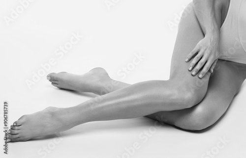 © Dimid, Naklejka premium Beautiful slender legs of a woman on a white background. Feet close up. Podiatrist appointment.
