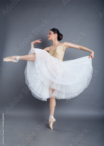Naklejka premium Beautiful slim woman ballet dancer in studio isolated on gray