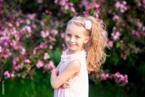 Fototapeta premium Beautiful smiling cute girl with long curly hair in blooming pink apples