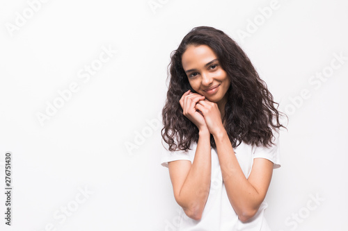 Fototapeta premium Beautiful smiling woman stands over studio wall