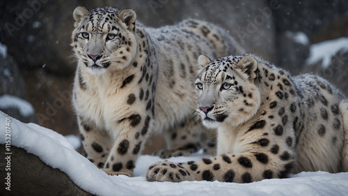 Naklejka premium Beautiful snow leopards exploring snowy rocks in a winter environment at dawn
