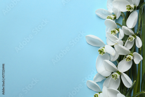 Fototapeta premium Beautiful snowdrops on light blue background, flat lay. Space for text