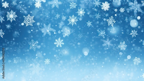 Fototapeta premium Beautiful snowflakes, lights and bokeh on blue gradient winter background.