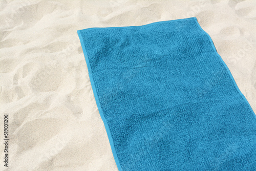 Fototapeta premium Beautiful soft blue towel on sandy beach
