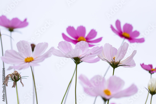© Rakchanok, Fototapeta premium Beautiful soft selective focus pink and white cosmos flowers field with copy space