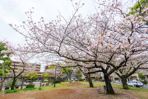 Obraz premium 都市公園で満開に咲く美しいソメイヨシノ(桜)。日本国神奈川県川崎市、渡田新町公園にて。 2024年4月12日撮影。Beautiful...